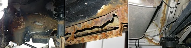 青森県東北町で使用。新車で納車して7年経過の防錆システム未施工の車両。鉄板と鉄板の合わせ目、スポット溶接部分からの錆び(腐食)が進行してます。
